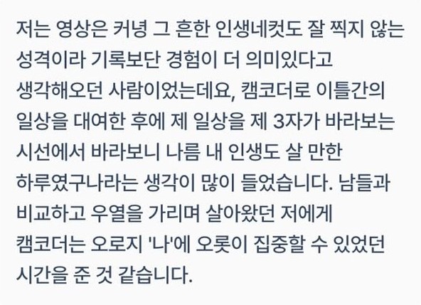 นํ๋ฒํผ์ ์บ ์ฝ๋ ๋์ฌ๋ฅผ ๋์ด, ์ผ์์ ๋ฐ๋ผ๋ณด๋ ์์ ์ ๋ฐ๊พธ๋ ๊ฒฝํ์ ์ ์ํด์. ์บ ์ฝ๋๋ฅผ ๋ค๊ณ ๊ฑฐ๋ฆฌ๋ฅผ ๊ฑท๋ ์๊ฐ, ๋๋ก ํ ์ผ ์ ํผ์ด์๋ ๋ค๊ฝ, ์ง๋๊ฐ๋ ์ฌ๋๋ค, ๋์์ ํผ์ณ์ง ๋ชจ๋ ๊ฒ๋ค์ด ์บ ์ฝ๋ ์ ์ํ์ ๋ฐฐ๊ฒฝ์ด ๋์ด ํน๋ณํ๊ฒ ๋๊ปด์ง๊ฑฐ๋ ์. ์ดฌ์ ํ ๋ฏ์ ๋์ ๋ชจ์ต์ ๋ชจ๋ํฐ๋ก ๋ณด๋ฉฐ ๋๋ฆ ๋ด ์ธ์๋ ์ด ๋งํ ํ๋ฃจ์๊ตฌ๋๋ผ๊ณ ๊นจ๋ซ๋ ์๊ฐ, ๊ทธ๊ฒ ๋ฐ๋ก ๋