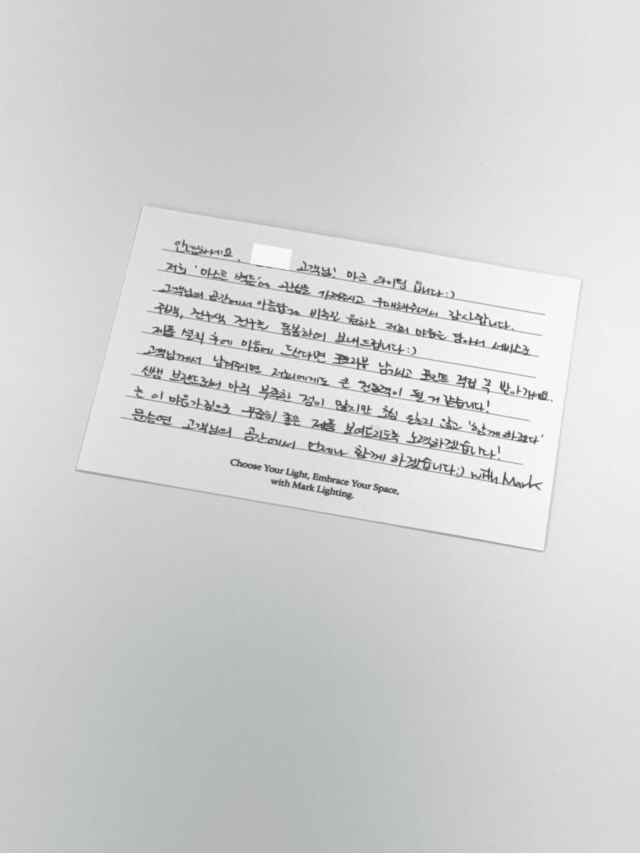 (Mark Lighting)'์ด์์. ๋ธ๋๋ ์ด๋ฆ๋ถํฐ ์๋ฏธ์ฌ์ฅํด์. '๋งํฌ(Mark)'๋ ํ์ , ์๊ตญ์ด๋ผ๋ ๋ป์ ๋ด๊ณ ์๊ฑฐ๋ ์. ์กฐ๋ช